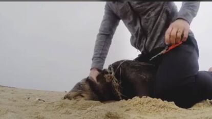 Un hombre salva a una foca que tenía un sedal de pesca alrededor del cuello