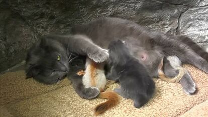 Hace unas semanas, una residente de Bajchisarai, en Crimea, se encontró cuatro ardillas huérfanas, y decidió llevarlas al Parque de Miniaturas de la localidad para encontrarles un hogar. Fue allí cuando Pusha, una gata que vive en el recinto desde hace años, decidió “adoptar” a los cuatro animales y empezó a tratarles como si fueran sus propias crías. En las imágenes, publicadas el pasado 25 de abril, se puede ver cómo la felina amanta y juega con las ardillas, y también cómo duerme protegiéndolas. “Los animales tardaron un tiempo en acostumbrarse, y al principio las ardillas tenían miedo de su nueva madre”, explican desde el parque, que no terminan de dar crédito a la familia que se ha formado. De hecho, los trabajadores del recinto ayudan a Pusha a alimentar a las ardillas con biberones con leche de cabra, ya que el animal no puede producir la suficiente leche para las cuatro ardillas.