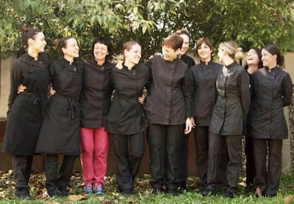 “Espero que llegue el día en que no sean necesarias asociaciones ni encuentros para reivindicar el reconocimiento de las mujeres, porque la igualdad sea efectivamente una realidad”. Así opina la cocinera catalana Fina Puigdevall, cuyo restaurante Les Cols cuenta con dos estrellas y está feminizado en su dirección gastronómica. Puigdevall trabaja con sus tres hijas, Martina y Carlota en los fogones y Clara en la sala. A punto de cumplir 29 años en mayo, Les Cols transita hacia un relevo generacional: “La mujer tiene que propiciar el cambio en su entorno, en su día a día. Los pequeños triunfos son los que hacen que la sociedad cambie”.