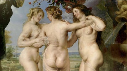 “No es muy glamuroso”, reconoce Tagliafierro al cruzar la puerta del espacio que su compañía, Karmachina, comparte con otros profesionales. Varias mesas blancas, alguna estantería; tal vez la zona expositiva casi oculta en un rincón sea el único indicio de que aquí se crea arte. Pero el tesoro existe, escondido en las pantallas donde Tagliafierro empieza a mover el cursor. Selecciona Dánae recibiendo la lluvia de oro, de Tiziano: la diosa griega es la elegida para mostrar su cirugía. “Una vez descargadas las obras en altísima resolución, identifico todos los elementos que quiero animar”, explica el creador. Suele sumar una cincuentena en cada cuadro. Recorta los brazos, las falanges de las manos de los protagonistas, la cortina y, en este caso, cada gota de oro.