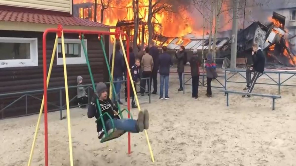 ¿Qué hacía este niño ruso en un columpio delante de un incendio?