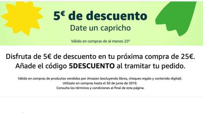 Una de las mejores ofertas de la semana viene de mano de Amazon, pero solo los más rápidos podrán aprovecharla. Todas las compras con un valor superior a 25 euros pueden disfrutar de una rebaja de 5 euros si se utiliza antes de pagar el código que encontrarás a continuación, y que solo puede utilizarse 9.600 veces. Aprovecha para adquirir cualquier cosa que necesites para el disfrutar del verano, para decorar la casa, para divertirte con tus amigos o lo que se te ocurra. Los únicos productos que quedan fuera de esta promoción son los contenidos digitales, cheques regalo y libros.