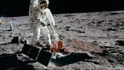 El astronauta del Apolo 11 Buzz Aldrin apenas pasó una hora y media pisando la Luna. En este tiempo tuvo que desplegar, entre otros instrumentos, un sismógrafo (ver imagen arriba) y un retrorreflector. En las sucesivas misiones Apolo, llegaron más. Con aquellos aparatos se pudo estudiar el grosor de la corteza lunar y anticipar como es el interior del satélite. También se detectaron hasta 28 lunamotos entre 1969 y 1977, cuando los sismógrafos aún operativos fueron desactivados.