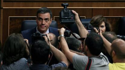 Pedro Sánchez mientras era fotografiado ayer en el Congreso. En vídeo, el podcast 'Las Noticias de EL PAÍS'.