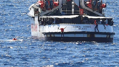 Varias personas saltan al agua desde el ‘Open Arms’ para intentar llegar a tierra