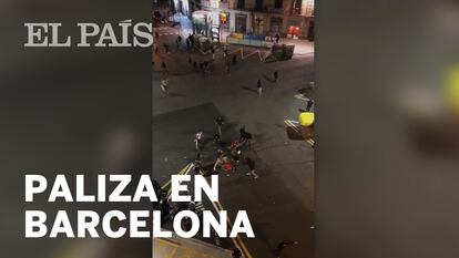Los antifascistas agreden a un chico con estética skinhead que llevaba un gran cuchillo y una bandera de España. #ProtestasCatalunya pic.twitter.com/oU3kxNNPEn