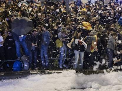 After the daytime march, many of the protesters headed toward the headquarters of the National Police for a demonstration organized by the pro-independence protest group, the Committees to Defend the Republic (CDR). There were more scenes of tension as protesters clashed with riot police, who fired foam bullets at the crowd. Three people were arrested in the protest.