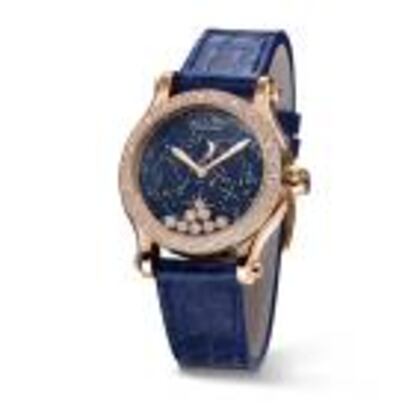 Chopard ha creado Happy Moon, un reloj que emula una bóveda celeste en la que siete diamantes móviles insertados en cápsulas de oro conforman un firmamento que muestra las fases lunares, coronado por una caja de oro rosa.