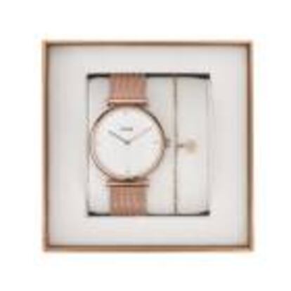 La firma Cluse propone un pack que incluye un reloj de formas depuradas y una pulsera de cadena fina rematada con un detalle de estrella, todo en elegante oro rosa.