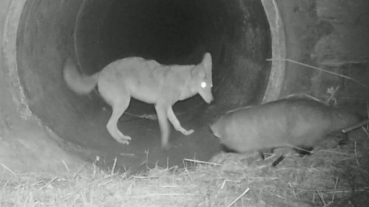 La extraña pareja: un coyote y un tejón cruzan juntos un túnel en EE UU
