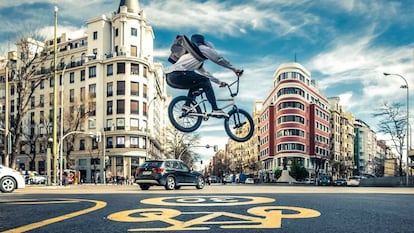 Un hombre tranquilo vuela sobre una bicicleta por las calles de Madrid