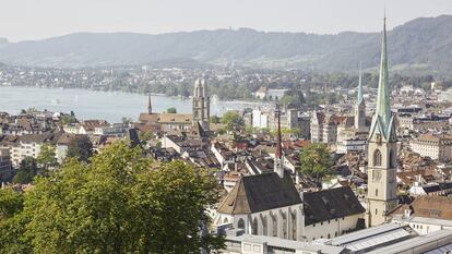 A mediodía, el sol cubre de purpurina de colores el lago y el río Limmat, que nace allí rumbo al norte. A lado y lado de las aguas, la ciudad se encarama sobre montañas hasta perderse en bosques. Solo las agujas de las casi 60 iglesias, protestantes y católicas, rompen su arquitectura de elegante serenidad desde la terraza de la ETH, en el costado oriental del río.