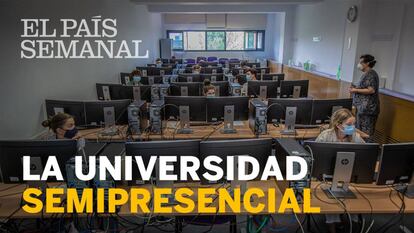 Este curso el común de las universidades españolas ha arrancado con un esquema híbrido de enseñanza presencial y virtual. Para garantizar las distancias de seguridad en las clases y evitar concentraciones en los campus se han reducido a menos de la mitad de asistentes las clases teóricas in situ. Los alumnos se dividen en grupos rotatorios: cuando unos están en el aula, otros ven la clase desde casa. Con vistas a la actividad presencial se priorizan las prácticas, el trabajo de laboratorio, los seminarios. El espacio y el tiempo de la enseñanza se han descoyuntado y cada institución trata de adaptarse. Cristina Gelpí, vicerrectora de proyectos de docencia de la Pompeu, señala el reto: “Lo técnico no es problema. Aquí llevábamos 10 años de transformación digital. Lo esencial es poder cuidar en esta situación la relación entre profesor y estudiante; cuando se pueda, de manera presencial, y cuando no, aprovechando las herramientas virtuales: los foros, las reuniones, los correos electrónicos, las videoconferencias”.