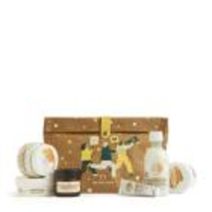 Una completa selección de productos de cuidado para el cuerpo con aroma a miel y almendras, en un original neceser de cartón reciclado tratado para que sea resistente al agua (49€).