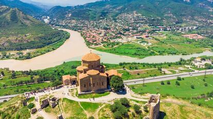 - El monasterio de Jvari (Mtskheta). Ubicada en la confluencia de los ríos Kura y Aragvi, Mtskheta es una de las ciudades más antiguas de Georgia y antigua capital del país. Hay al este una colina desde donde se dominan Miskheta y la confluencia de los dos ríos. Sobre ella se alza Jvari, de la Santa Cruz, obra maestra del estilo georgiano antiguo y corazón simbólico del país.