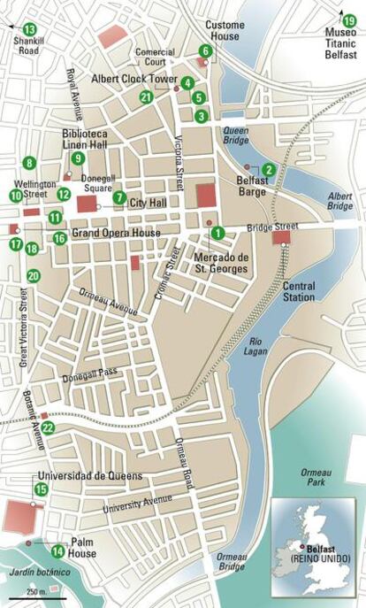 Entre el Albert Bridge y el Queen Bridge se pasea junto al río Lagan descubriendo estampas de una añeja Belfast industrial. Para conocer más de la tradición naval de la ciudad está el Belfast Barge (2) (www.laganlegacy.com), un barco-museo-café desde el que se percibe el esfuerzo por lograr que la ciudad mire el río y apueste por una esclusa en plan bonito. Ring of thanksgiving, una clásica escultura gigante de Andy Scott, acaba de engalanar el recorrido. Si no está de buen humor, abra la puerta de Elliotts Fancy Dress Shop (3), tiene todo lo imaginable para disfrazarse (www.elliottsbelfast.co.uk) y transmite júbilo.