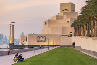 El Museo de Arte Islámico de Doha (4), proyectado por el arquitecto Ieoh Ming Pei, será la próxima parada. Se encuentra en una isla artificial en pleno centro, rodeado de estanques y pasarelas flanqueadas de palmeras. Para su concepción, el arquitecto estadounidense de origen chino hizo una inmersión en la arquitectura islámica, optando por la forma geométrica del mocárabe, presente en la mezquita de Ibn Tulun, en El Cairo (siglo IX). Antes de visitar la colección, rica en astrolabios, vidrios mamelucos, textiles y cerámica procedentes de Al Andalus, Egipto, Turquía, Irán e India, comeremos en su restaurante, pilotado por el chef francés Alain Ducasse: una fiesta para los sentidos ubicada en la planta superior, abierta a la bahía.