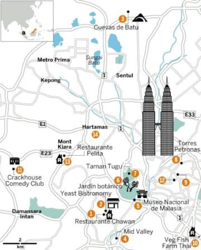 La cultura local no trata de imponerse, pero los cánones exigen comer nasi lemak para desayunar: porciones de arroz enriquecidas con coco, carne especiada, anchoas fritas, pepino, nueces y sambal. El restaurante Chawan (1) (Jalan Telawi, 3), en el barrio de Bangsar, no decepciona. Ambiente local, o global, si se quiere. Indios, chinos y malayos con la tarjeta de control de acceso a sus puestos de trabajo. También sirven el célebre roti indio, que hace las delicias del cliente con sus salsas picantes. Dicen de Bangsar que es el barrio hipster de Kuala Lumpur. Muy cerca se encuentra Yeast (2), una pastelería de estilo francés, otra opción donde desayunar.