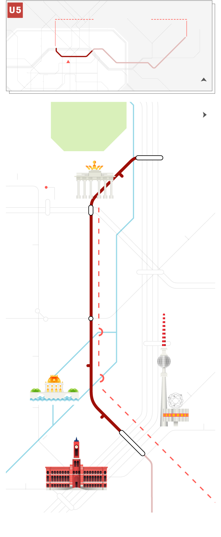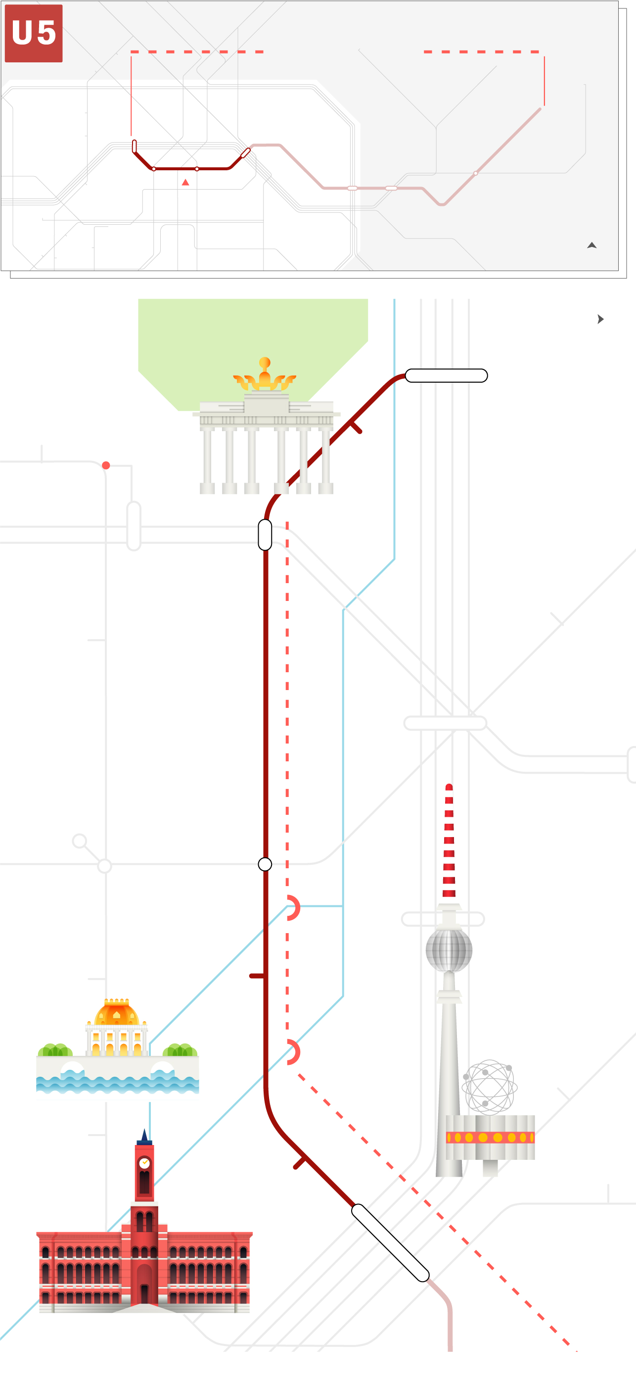 A tal concentrado de historia alemana, europea y mundial le faltaba el metro como hilo conductor. Y ese es el eslogan del nuevo tramo de la U5. Cada estación, con el sello de un arquitecto y un motivo de inspiración.