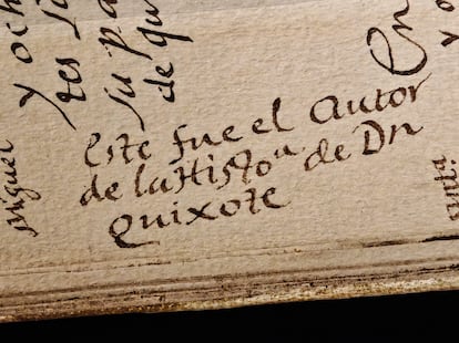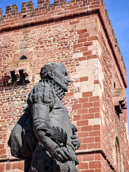 Al pie del torreón está el protagonista de otra gran película. Es Cervantes, que nació en Alcalá de Henares (Madrid) en 1547 y, 11 años después, no se sabe cómo, volvió a hacerlo en Alcázar de San Juan. Los alcazareños muestran orgullosos la pila donde fue cristianado, ahí al lado, en la colegiata de Santa María la Mayor (6), y la partida de bautismo de un tal Miguel, hijo de Bias de Cervantes y de Catalina López, fechada el 9 de noviembre de 1558, con una nota marginal de 1748 que indica: “Este fue el autor de la historia de Don Quixote”. La verdad es que, de haber nacido en 1558, Cervantes no habría perdido la movilidad de un brazo en la batalla de Lepanto (1571), sino el biberón. No se puede tachar de ilusos a los alcazareños. Después de todo, el hijo más famoso del escritor, Don Quijote, lo es por haber visto lo que nadie más en el mundo: gigantes en lugar de molinos, castillos en vez de ventas y a una princesa afincada en El Toboso.