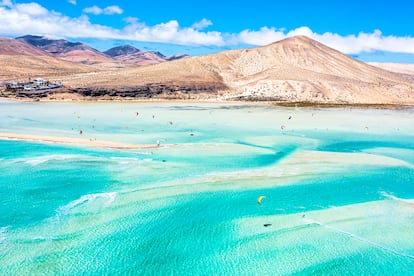Y es que si hay algún elemento de la naturaleza que defina con rigor el talante de Fuerteventura ese es el viento. Cuando René Egli aterrizó en la isla en 1984 quedó fascinado con las extraordinarias condiciones que ofrecían las corrientes de aire en la playa de Sotavento para la práctica de windsurf. Apasionado de este deporte, el empresario suizo decidió levantar en esta costa, junto a la cadena hotelera Meliá Hotels International, una escuela donde enseñar esta disciplina y también kitesurf. La que ellos mismos catalogan como la mayor del mundo; cuenta con 25.000 clientes que se mueven hasta sus confines cada año. Con más de 35 años de experiencia a sus espaldas, no solo es el lugar oportuno para iniciarse en la práctica de estos deportes, sino también para contemplar en verano a algunos de los mejores deportistas que compiten en la Copa del Mundo de Windsurf, Wingfoil y Kitesurf celebrada desde hace décadas. Cuenta también con una zona de chill out en la que fundirse con el atardecer que refleja la laguna, un fenómeno intermitente que llega a albergar cuatro kilómetros de aguas tranquilas en las fases de luna llena y nueva.