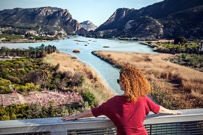 Cerca de esta giganta hay un panel informativo que invita a seguir la Ruta de las Norias o SL-MU 28, un sendero circular de 4,4 kilómetros diseñado para ver las cuatro mayores joyas etnográficas de Abarán y de toda la huerta murciana paseando río arriba y río abajo durante un par de horas. Que pueden ser y serán tres o cuatro, porque se para continuamente. Ya nada más comenzar, hay que detenerse en la angostura de Las Canales para observar el rastro dejado en las rocas por una acequia andalusí y cómo el Segura tuerce aquí formando un ángulo recto y ofreciendo una foto magnífica, como hecha con un ojo de pez. Su agua verde, verdísima ―el color complementario del rosa―, haría un contraste formidable con los melocotoneros en flor. Pero no hay ningún campo de ellos a la vista. Lástima. Solo cañaverales y aves acuáticas: cormoranes grandes, martines pescadores, garzas reales… Tampoco está mal para empezar.