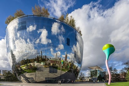 Otro icono arquitectónico del mismo estudio es el Depósito del Museo Boijmans Van Beuningen, un enorme edificio de espejos que no pasa desapercibido. Ubicado en el Parque de los Museos, alberga desde su inauguración en 2021 la inmensa colección del museo holandés ―cerrado para su restauración desde 2019―, con más de 155.000 obras de arte que van desde la Edad Media hasta la actualidad. El estudio de arquitectura proyectó este gran depósito para que fuese un edificio sostenible, contemplando el uso de luz natural, entre otras medidas, y contribuyendo a su mimetización con las zonas verdes que lo rodean con los espejos de la fachada y el despliegue de un jardín en su azotea.