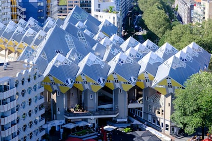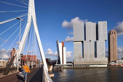 Róterdam es una ciudad para mirar hacia arriba. Absténganse aquellos con cervicales delicadas, porque la segunda urbe más poblada de los Países Bajos ―con casi 600.000 habitantes, por detrás de Ámsterdam― es un recital arquitectónico de diferentes estilos y, sobre todo, de enormes dimensiones. La veintena de edificios que superan los 100 metros de altura así lo acreditan. Sus construcciones también revelan una predilección por la arquitectura, el urbanismo y un afán por seguir creciendo. Solo así se explica la necesidad de construir dos grandes pasos de un kilómetro de longitud que unen el distrito centro y el sur, salvando el río Nuevo Mosa.