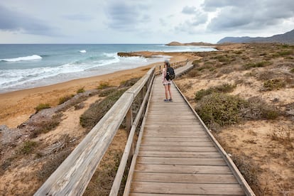 Un poco más adelante está Agua Amarga, que, pese a su nombre, resulta ser una fabulosa playa blanca de pueblo, presidida por bares de tapas. A dos kilómetros está la cala de Enmedio, resguardada, con repisas de roca para tomar el sol. Y también por allí, la playa de San Pedro, una cala pintoresca enmarcada por cabos espectaculares, accesible solo a pie. Agua Amarga es un lugar de vacaciones chic-bohemio adorado por españoles urbanitas y escandinavos sedientos de sol. Tiene una ancha y popular playa de arena, y desde aquí hasta San Miguel, una red de carreteras y sendas que van bordeando los 50 kilómetros de costa. Es una caminata que para completarla requeriría varios días y que conviene hacer cuando no apriete el sol, pero siempre se pueden recorrer tramos del recorrido y pasar por playas que de otro modo son inaccesibles.