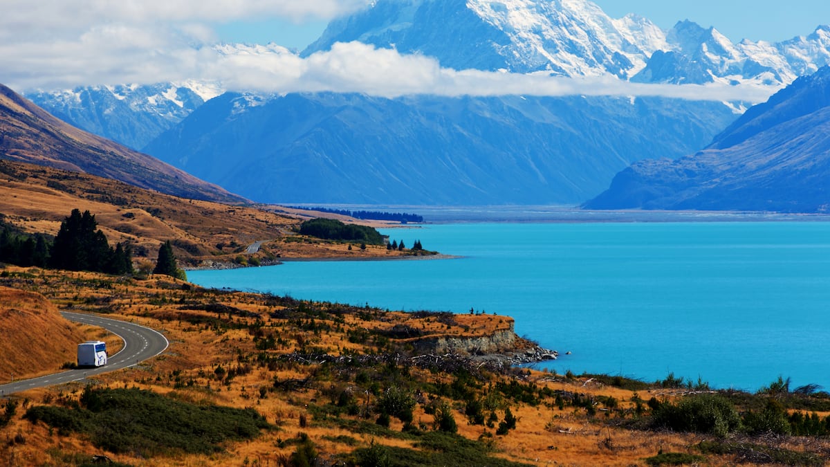 3. Lago Pukaki. Uno de los lagos más grandes de la Isla Sur. Su increíble color turquesa es debido a las partículas en suspensión que tiene procedentes de los glaciares cercanos. Es la antesala del monte Cook, con preciosas vistas de los Alpes del Sur (que se reflejan en sus aguas) y senderos para circunvalarlos.