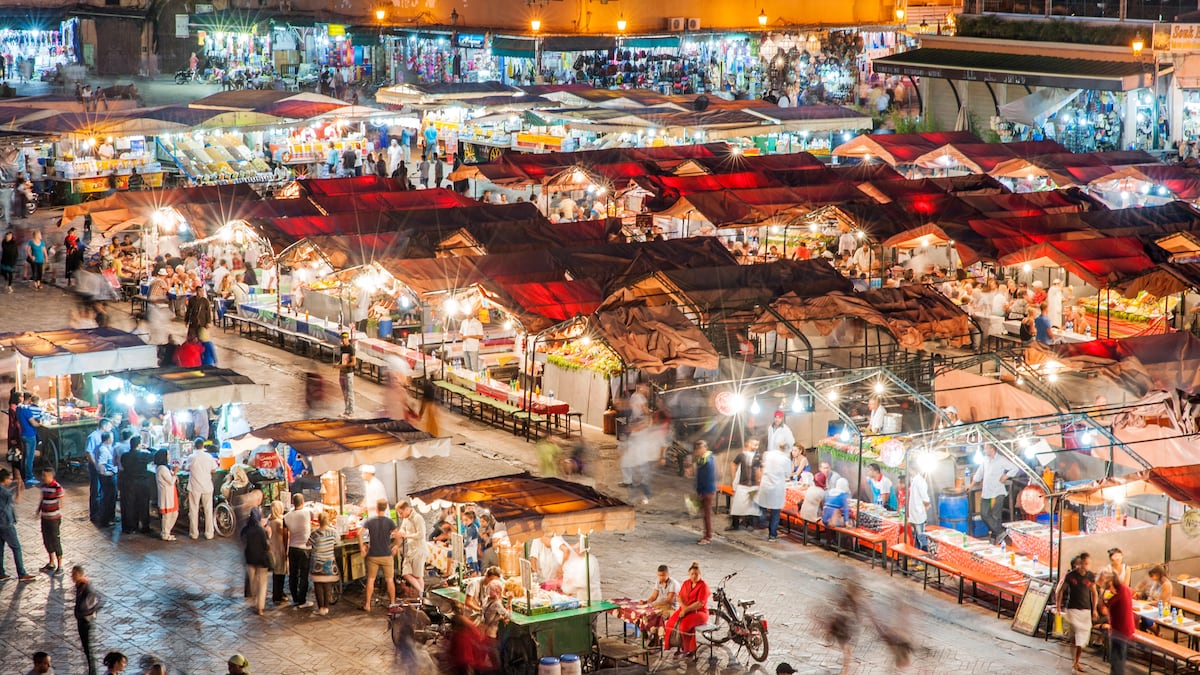 Ambiente nocturno en la plaza Jemaa el-Fna, en Marraquech (Marruecos).Vídeo: Paco Nadal / Eric Nathan (Alamy)