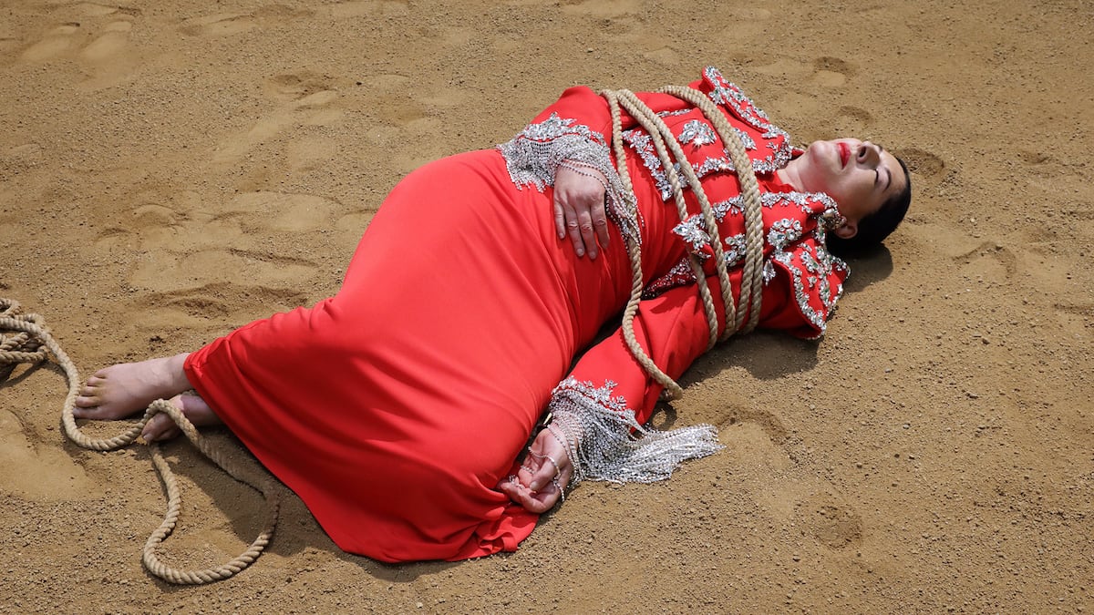 César Jiménez no se equivoca. Salto atrás a Belgrado, 1974: una joven Abramovic realizó la performance Rhythm 5, en la que con listones de madera trazaba en el suelo una estrella de cinco puntas, le prendía fuego y se tendía dentro. Las llamas consumieron el oxígeno y perdió el conocimiento. Afortunadamente, alguien de entre el público lo intuyó y la sacó de allí: unos minutos más y habría muerto. Y no fue la única vez. Al cabo de unos meses, representando en Nápoles Rhythm 0, donde se sometía desnuda a los deseos del público, recibió un corte en el cuello y un tipo llegó a apuntarla con una pistola cargada.