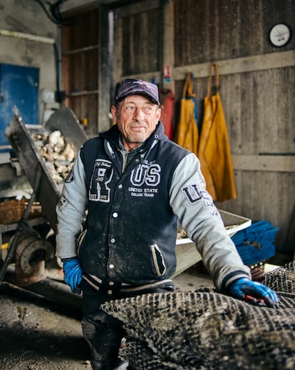 Uno de los más carismáticos es Jean-Luc Tonneau, que nos ha citado a las siete en punto de una mañana de viento gélido para internarnos en el mar sobre el remolque del tractor que conduce su amigo Sebastien. Hasta que Tonneau no nos presta un cortavientos de su talla no respiramos tranquilos. Nos adentramos cuatro kilómetros para comprobar el estado de su stock repartido en tres hectáreas. Recorremos el fondo del mar como si pisáramos un paisaje lunar que adquiere visos de desierto. Está amaneciendo y en la línea del horizonte vibra una luz que intenta ser cárdena. Por encima del runrún del motor, Jean-Luc grita: “¡Es bonito mi despacho, ¿verdad?!” Ya con los pies en el mullido suelo marino, nos apremia porque el nivel del agua empieza a subir y amenaza con borrarnos del mapa. Tonneau revisa en cada marea el estado de las ostras con las que mantiene su puesto de degustación en la carretera que lleva al Mont Saint-Michel. En 2024, con su creuse especial —insuperable ostra de autor— ganó la medalla de oro en el salón de agricultura de París. “Yo no quiero crecer. Soy un productor pequeño. Así puedo acompañar a la ostra desde que nace, ver cómo se redondea mientras el pescado crece al nivel de la concha”. Muestra el estanque con agua de mar y fitoplancton donde afina las otras. “Produzco 50 toneladas al año y como mis ostras cada día”. Pura lógica.