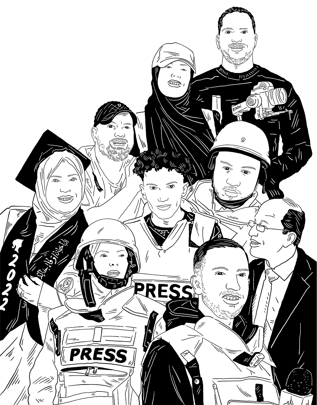 Abdalah Alwan, 18 de diciembre de 2023 ■ Abdalah Iyad Breis, 8 de enero de 2024 ■ Abdel Rahman al Tanani, 18 de noviembre de 2023 ■ Abdelhalim Awad, 18 de noviembre de 2023 ■ Abdul Rahman Bahr, 5 de octubre de 2024 ■ Abdul Rahman Saima, 14 de marzo de 2024 ■ Abdulah Darwish, 1 de diciembre de 2023 ■ Abdulhadi Habib, 16 de octubre de 2023 ■ Adel Zorob, 19 de diciembre de 2023 ■ Adham Hasuna, 1 de diciembre de 2023 ■ Ahmad Qalaya, 6 de junio de 2025 ■ Ahmad Yamal al Madhun, 24 de diciembre de 2023 ■ Ahmed Abu al Rus, 15 de enero de 2025 ■ Ahmed Abu Aziz, 25 de agosto de 2025 ■ Ahmed Abu Mhadi, 25 de octubre de 2023 ■ Ahmed Abu Sharia, 19 de noviembre de 2024 ■ Ahmed Abu Sjeil, 9 de noviembre de 2024 ■ Ahmed al Helu, 15 de mayo de 2025 ■ Ahmed al Luh, 15 de diciembre de 2024 ■ Ahmed al Qara, 10 de noviembre de 2023 ■ Ahmed al Shayyah, 15 de enero de 2025 ■ Ahmed Bdeir, 10 de enero de 2024 ■ Ahmed Mansur, 7 de abril de 2025 ■ Ahmed Shehab, 12 de octubre de 2023 ■ Ahmed Yaireddine, 28 de diciembre de 2023 ■ Akram el Shafi, 5 de enero de 2024 ■ Al Hasan Hamad, 6 de octubre de 2024 ■ Alaa al Hams, 12 de febrero de 2024 ■ Amal Zohud, 18 de noviembre de 2023 ■ Amr Abu Odeh, 31 de octubre de 2024 ■ Amro Salah Abu Hayah, 18 de noviembre de 2023 ■ Amyad Yuhyuh, 6 de julio de 2024 ■ Anas al Sharif, 10 de agosto de 2025 ■ Angam Ahmad Edwan, 12 de febrero de 2024 ■ Areey Shaheen, 3 de enero de 2025 ■ Asem al Barsh, 22 de noviembre de 2023 ■ Asem Kamal Musa, 17 de diciembre de 2023 ■ Ayat Yadura, 20 de noviembre de 2023 ■ Ayman al Gedi, 26 de diciembre de 2024 ■ Ayman al Guarbawi, 26 de abril de 2024 ■ Ayman al Rafati, 14 de febrero de 2024 ■ Ayman Haniyeh, 2 de septiembre de 2025 ■ Bahaaddine Yasine, 10 de mayo de 2024 ■ Bilal Rayab, 1 de noviembre de 2024 ■ Bilal Yadalah, 19 de noviembre de 2023 ■ Duaa Sharaf, 26 de octubre de 2023 ■ Duaa Yabbur, 9 de diciembre de 2023 ■ Fadi Hasuna, 26 de diciembre de 2024 ■ Faisal Abu al Qumsan, 26 de diciembre de 2024 ■ Fatma Hasona, 16 de abril de 2025 ■ Hamada al Yaziyi, 3 de diciembre de 2023 ■ Hamza al Dahduh, 7 de enero de 2024 ■ Hamza Murtaya, 20 de agosto de 2024 ■ Haneen Barud, 27 de octubre de 2024 ■ Haneen Kashtan, 17 de diciembre de 2023 ■ Hasan Abu Warda, 25 de mayo de 2025 ■ Hasan al Qishawi, 2 de enero de 2025 ■ Hasan Farayalah, 3 de diciembre de 2023 ■ Hasan Samur, 15 de mayo de 2025 ■ Hasuneh Salim, 18 de noviembre de 2023 ■ Heba al Abadla, 9 de enero de 2024 ■ Hilmi al Faqaawi, 7 de abril de 2025 ■ Hisham Alnwayha, 9 de octubre de 2023 ■ Hosam Shabat, 24 de marzo de 2025 ■ Husam Mubarak, 13 de octubre de 2023 ■ Husam al Dabbaka, 22 de agosto de 2024 ■ Husam al Masri, 25 de agosto de 2025 ■ Ibrahim al Guarbawi, 26 de abril de 2024 ■ Ibrahim Marzuq, 24 de octubre de 2023 ■ Ibrahim Mohamad Lafi, 7 de octubre de 2023 ■ Ibrahim Muhareb, 18 de agosto de 2024 ■ Ibrahim Sheij Ali, 26 de diciembre de 2024 ■ Ibrahim Zaher, 10 de agosto de 2025 ■ Iman al Shanti, 11 de diciembre de 2024 ■ Imad al Wahidi, 31 de octubre de 2023 ■ Isam Bhar, 17 de octubre de 2023 ■ Islam Abed, 31 de agosto de 2025 ■ Ismail Abu Hatab, 30 de junio de 2025 ■ Ismail al Gul, 31 de julio de 2024 ■ Ismail Baddah, 5 de junio de 2025 ■ Iyad el Ruwagu, 25 de enero de 2024 ■ Iyad Matar, 1 de noviembre de 2023 ■ Mahdi al Mamluk, 11 de noviembre de 2024 ■ Mahmud Islim al Basos, 15 de marzo de 2025 ■ Mahmud Yuhyuh, 16 de mayo de 2024 ■ Maisara Ahmed Salah, 30 de noviembre de 2024 ■ Mamduh Qanita, 30 de noviembre de 2024 ■ Mariam Abu Dagga, 25 de agosto de 2025 ■ Marwan al Sawaf, 1 de diciembre de 2023 ■ Mayd Fadl Arandas, 1 de noviembre de 2023 ■ Mayed Kashko, 31 de octubre de 2023 ■ Moamen Abu al Uf, 9 de junio de 2025 ■ Moamen Aliwa, 10 de agosto de 2025 ■ Moaz Abu Taha, 25 de agosto de 2025 ■ Mohamad al Bayyari, 2 de noviembre de 2023 ■ Mohamad al Iff, 24 de diciembre de 2023 ■ Mohamad al Yaldi, 10 de agosto de 2025 ■ Mohamad Balusha, 17 de octubre de 2023 ■ Mohamad Yargun, 7 de octubre de 2023 ■ Mohamed Abed Rabbo, 27 de agosto de 2024 ■ Mohamed Abu Daqqa, 29 de julio de 2024 ■ Mohamed Abu Hasira, 7 de noviembre de 2023 ■ Mohamed Abu Hatab, 2 de noviembre de 2023 ■ Mohamed Abu Sharia, 1 de julio de 2024 ■ Mohamed Abu Yaser, 20 de julio de 2024 ■ Mohamed Adel Abu Sjeil, 28 de marzo de 2024 ■ Mohamed Alaa al Sawalhi, 17 de septiembre de 2025 ■ Mohamed al Kuaifi, 15 de septiembre de 2025 ■ Mohamed al Ladaa, 26 de diciembre de 2024 ■ Mohamed al Qrinawi, 14 de diciembre de 2024 ■ Mohamed al Sakani, 4 de julio de 2024 ■ Mohamed al Salhi, 7 de octubre de 2023 ■ Mohamed al Sharafi, 18 de diciembre de 2024 ■ Mohamed al Talmas, 14 de enero de 2025 ■ Mohamed al Tanani, 9 de octubre de 2024 ■ Mohamed Ali, 20 de octubre de 2023 ■ Mohamed Atalah, 29 de enero de 2024 ■ Mohamed Azzaytuniyah, 24 de diciembre de 2023 ■ Mohamed Balusha, 14 de diciembre de 2024 ■ Mohamed Basam al Yamal, 25 de abril de 2024 ■ Mohamed el Reefi, 15 de marzo de 2024 ■ Mohamed el Sayed Abu Sjeil, 18 de marzo de 2024 ■ Mohamed Imad Labad, 23 de octubre de 2023 ■ Mohamed Isa Abu Saada, 6 de agosto de 2024 ■ Mohamed Manhal Abu Armana, 13 de julio de 2024 ■ Mohamed Mansur, 24 de marzo de 2025 ■ Mohamed Meshmesh, 15 de julio de 2024 ■ Mohamed Muin Ayyash, 23 de noviembre de 2023 ■ Mohamed Nabil al Zaq, 22 de noviembre de 2023 ■ Mohamed Naser Abu Huwaidi, 23 de diciembre de 2023 ■ Mohamed Nufal, 10 de agosto de 2025 ■ Mohamed Qreiqeh, 10 de agosto de 2025 ■ Mohamed Salama, 25 de agosto de 2025 ■ Mohamed Sobh, 9 de octubre de 2023 ■ Mohamed Yagui, 23 de febrero de 2024 ■ Mohamed Yalifeh, 22 de diciembre de 2023 ■ Mohamed Yamal Sobhi al Thalathini, 11 de enero de 2024 ■ Montaser al Sawaf, 1 de diciembre de 2023 ■ Mosab Ashur, 18 de noviembre de 2023 ■ Mostafa al Saw