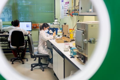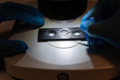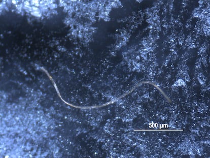 Es rojo, largo, fino, retorcido como un gusano inmóvil y mide 250 micras. Es decir, tiene el tamaño de un grano de arena, apenas perceptible a los ojos humanos aunque ahora aparece grande en una pantalla, aumentado por las lentes de un microscopio. Pero ese filamento nació en otra parte, con otra forma. Quizás era una camiseta o un forro polar, ropa sintética hecha con millones de microfilamentos iguales que provienen del plástico y que han acabado desintegrándose en miles de millones de microplásticos que flotaban en el aire en bucles infinitos, zarandeados por el viento de un lado a otro, hasta que fueron inspirados por alguien. Y la microfibra yació en sus pulmones humanos meses, quizás años, hasta ser extraído para acabar en una placa de Petri, bajo la lupa, observado por Marina Núñez Rubio, investigadora predoctoral de Biología, de la Universidad Autónoma de Madrid.