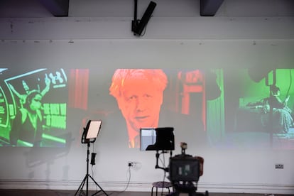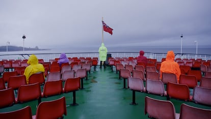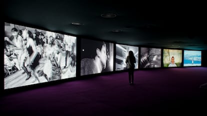 En un despacho de la galería que lo representa, Lisson (una de las más poderosas del mundo), en el centro de Londres, Akomfrah cuenta su historia en tono cálido y cercano que puntúa con explosiones de risa. Es el artista que el año pasado representó al Reino Unido en la Bienal de Venecia con Listening All Night to the Rain (escuchando toda la noche la lluvia), una vasta instalación audiovisual multipantalla que, dividida en “cantos” o capítulos, expone temas como la emergencia climática, los movimientos migratorios, la historia colonial y en general la experiencia humana, a través de un bombardeo de imágenes de archivo o rodadas ex profeso. Desde el 4 de noviembre, esta ópera magna puede verse en el Museo Thyssen-Bornemisza gracias a la Fundación TBA21, de Francesca Thyssen-Bornemisza, que estuvo involucrada en el proyecto desde su inicio, y que hace siete años ya llevó a la institución madrileña otro trabajo reciente del mismo autor, Purple (2017).