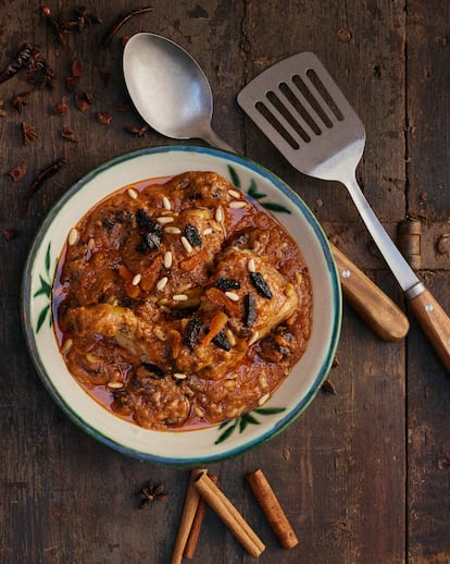 Cuando la cebolla tenga color, devolver el pollo y cubrir con el vino, el brandi y los frutos secos (se pueden reservar algunos para decorar) y cocinar unos 60 minutos a fuego suave, añadiendo un poco de agua o caldo si se seca.