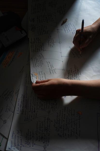 Anna se enorgullece de formar parte de la lista negra de autores en su país por haberse opuesto al régimen de Putin. “No voy a poder volver a trabajar allí en nada relacionado con la escritura”, dice. Sus novelas se forman en enormes cartulinas blancas que parecen mapas de palabras, cronologías que parten de una línea que las divide. Son alargadas, rectangulares. “Las coloco en el suelo mientras escribo. No lo tengo todo planeado, pero casi”, afirma, y se revuelve el pelo, que le ha crecido un poco, y parece ligeramente rizado, su aire es decididamente de los noventa, grunge.