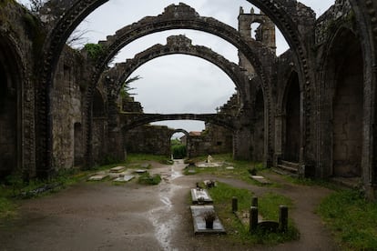 “La primera vez que entras, lo que ves resulta espectacular: parece un barco al que le dieron la vuelta y quedó aquí, anclado”, dice el historiador Sindo Mosteiro. En efecto, los arcos apuntados de la iglesia —descarnados, sin cubierta, a la intemperie— simulan las cuadernas de un viejo navío varado, ya inerte. La estructura parece débil, pero el paso del tiempo la ha fortalecido, fosilizándola. A principios del siglo XV, cuando se tuvo noticia de su construcción, todo era color. Las bolas que adornaban las arcadas góticas estaban pintadas. Cuando el templo se quedó sin tejado, mediado el XIX, el clima gallego —su lluvia— comenzó a apagar aquellas vivas tonalidades, hasta anularlas por completo. El granito acabó adquiriendo el mismo tono que cualquiera de las fachadas de los edificios nobles de Cambados (Pontevedra), un tenue gris salpicado por los líquenes.