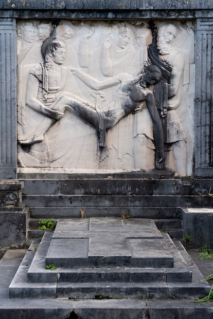 De regreso a la entrada, Aguirre hace parada en una de sus debilidades personales. Sobre un frontal de piedra aparece la escena cristiana del descendimiento de la cruz, obra de Gregorio Helzel. “Es un estilo de moda en los años treinta, influenciado por ideologías muy estrictas, como el fascismo: dedos gruesos y formas y rostros muy duros”, pormenoriza. Aunque Víctor Manuel ha dejado para el final de la visita —que, en realidad, es el punto culminante de este itinerario artístico— un testimonio que reafirma los cementerios como lugares de arte y patrimonio, sitios donde los creadores proyectaron obras vetadas fuera de ellos. “Lo más interesante de este conjunto es el ángel anunciador, con formas de mujer, vestido a la manera egipcia”, indica. Se trata de un voluminoso mausoleo realizado en estilo secesionista, solo afeado por la reciente restauración de sus elementos de bronce con un grosero espray dorado. “Es la culminación de la obra de Leonardo Rucabado”, valora Aguirre. Lo construyó a principios del siglo XX para la familia de su esposa, los Del Sel. Para su desgracia, el prolífico diseñador murió de gripe con tan solo 43 años. “Él nunca pensaría ser de los primeros en enterrarse aquí”, presume el historiador. Fue la aportación más valiosa de Rucabado a este museo que, quizá, podrá disfrutar… desde el otro mundo.