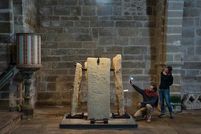 Quizá resida en su belleza —en el atractivo de las ruinas románticas— la clave de la salvación. Parece confirmarlo el incesante goteo de turistas que recorren el paraje perplejos. Unos se fijan en la arquitectura o en las sepulturas, otros aprovechan la tregua de la lluvia para hacerse un selfi junto a las arcadas. “Cuando hay luna llena, la luz dulce de la noche baña las molduras del edificio y el escenario resulta superevocador”, resalta Mosteiro. Un encanto innegable, pero no exclusivo en Galicia. A menos de una hora en coche hacia el norte, siguiendo la línea costera, el camposanto de Noia —un pueblo de A Coruña de similar población— registra un interminable reguero de visitantes. Acuden al recinto, incrustado en pleno centro urbano, para certificar que los balcones de los edificios vecinos se asoman por sus cuatro costados a un palmo de las tumbas. Ya en el interior de la iglesia de Santa María a Nova (siglo XIV, estilo gótico marinero) se expone una pequeña parte de su extensa colección de lápidas medievales, una de las más valiosas del mundo.
