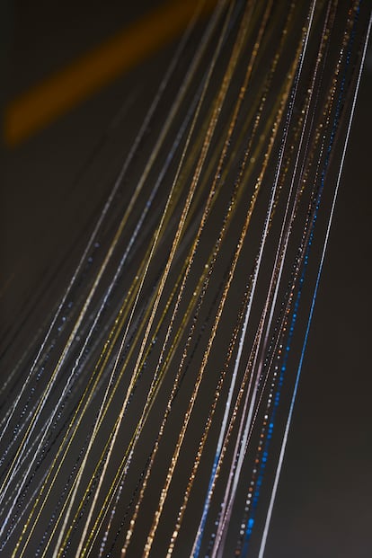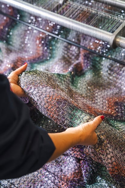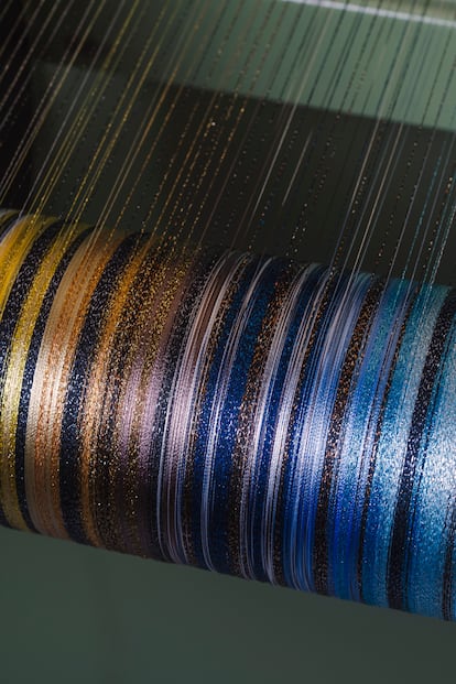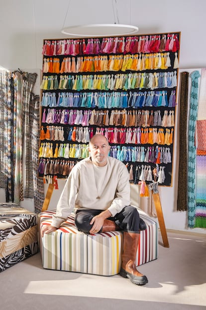 Ideado inicialmente para hacer alfombras, Ottavio lo adoptó y lo adaptó, convirtiéndolo en piedra angular de la experimentación textil con la que hizo que sus tejidos se acercaran más al arte que a la confección. Es un pintor “en el sentido más completo, mágico y alquímico de la palabra”, le definía Flavio Caroli. No es un telar rápido ni productivo en el sentido que pide ese bando de la industria afanado en hacer más, vender más, facturar más. Pero es “la mejor máquina para la mente creativa”, defiende Alberto Caliri (Sorrento, 55 años), director creativo de la casa desde octubre de 2024, aunque se unió a sus filas en 1998, a las órdenes de Angela, hija de los fundadores. Es una máquina pensada para inventar, no repetir en serie. “Las posibilidades son infinitas. Bueno, no, porque producción me mataría”, puntualiza. “Pero, en teoría, no hay límites”. Lo que lo hace único es la disposición para mezclar varios tipos de hilos. Hasta 1.200. Así se logran las superficies vibrantes, los juegos de color, los efectos ópticos.