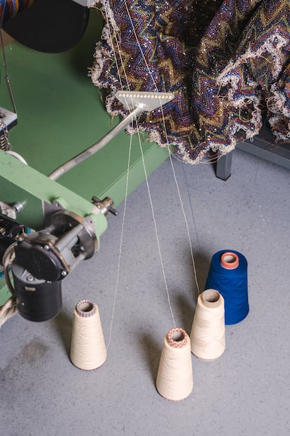 Lejos del zumbido monótono que compone la banda sonora de cualquier fábrica moderna, el suyo es un sonido irregular, articulado, orgánico. Mecánico pero no automático. Un corazón que lleva 70 años bombeando color. Avanza con una lentitud casi obstinada, negándose a ceder a las prisas de estos locos años veinte. Aquí el ritmo lo impone un proceso que aún exige las manos de un artesano. “El error, la sorpresa, el accidente: son importantes en mi trabajo”, dice Caliri. “En Missoni, el material siempre es el eje”. Al contrario que en la mayoría de las firmas de moda, el tejido no sigue al diseño. “Trabajar así te obliga a adaptarte, pero también a ser más creativo y menos convencional, tomar caminos que no habías considerado. Te conduce a algo nuevo”.