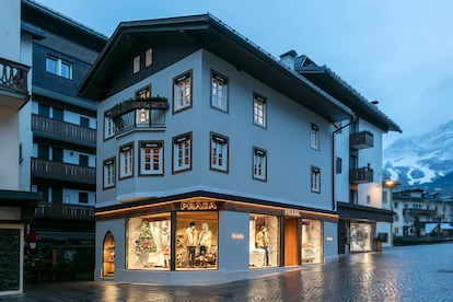 Tampoco hay mucho más donde rascar: a excepción de la cápsula après-ski presentada por Lacoste como tributo al 70º aniversario de aquellos Juegos de 1956, de sugerente inspiración retro y bajo licencia del propio Comité Olímpico Internacional (COI), y de la línea Cortina a Colori que ofrece Harmont & Blaine en la tienda pop-up instalada en el centro comercial La Cooperativa, una institución de las compras tradicionales en la villa, ninguna otra firma, ni de lujo ni de gran consumo, se ha hecho cargo de la situación. Bueno, solo una: Prada, que ha ocupado las tres plantas de un edificio histórico de estilo Liberty en pleno centro de la ciudad para despachar sus colecciones de mujer y hombre durante los días de competición. Claro que a los paseantes de Corso Italia tampoco los impresiona: saben que las modas pasan y que solo su estilo permanece. Por algo cada diciembre, desde hace tres lustros, celebran su propia fashion week, la genuina pasarela del chic de alta montaña.
