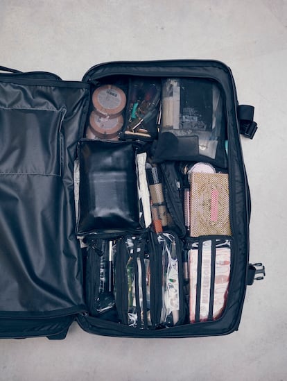 “En España estaba instaurada la idea de que el maquillador tenía que vestir de negro y quedarse detrás sin opinar”, reconoce Alex Saint (Orihuela, Alicante, 35 años). “Ahora está empezando a entenderse más que son personas con todo tipo de inquietudes, que pueden expresarse de distintas maneras”. A ella, huracán de creatividad, le costó que la tomaran en serio por salirse del canon: empezó como fotógrafa, fue mánager de la modelo Jessica Goicoechea, tiene un perfil potente en redes y ha participado como actriz en varios proyectos (Veneno o Superestar). “Si me llaman Los Javis, ¡cómo les voy a decir que no! Lo he vivido de una manera muy libre y quizá inconsciente, porque recuerdo a compañeros más mayores decirme que no debía hacer un photocall o subir mi foto”. Aprendió técnica en YouTube, viendo horas y horas de vídeos de Lisa Eldridge, pero reniega de la velocidad que hoy marca el algoritmo: “Como artista me resulta tremendamente cansada la inmediatez. Para que haya creatividad debería haber un espacio y sobre todo un tiempo, para hacer algo que tenga significado. Pero en este sistema todo está marcado por los números”. Como sus compañeros, destaca el valor de los referentes. Ella, mujer trans, se ha convertido además en uno poderoso para quienes vienen detrás. “Cuando era pequeña, y han pasado unos años pero no tantos, no supe de ninguna chica trans. Así fue hasta cumplir los 20. Hoy pienso en la suerte de los jóvenes por tener a gente como Hunter Schafer o Alex Consani”. Maquilladora de cabecera de Aitana o Ester Expósito, también arroja luz sobre la parte menos resplandeciente del oficio: “Es una profesión solitaria en la que se viaja mucho con distintos equipos. Soy amiga de Aitana y es increíble ir de gira con ella, pero cuando acaba el día cada una se va a su habitación de hotel. Es difícil de compaginar con relaciones personales o de cualquier tipo. Tengo sobrinos pequeños y cuando voy a mi pueblo les cuesta ubicarme”.