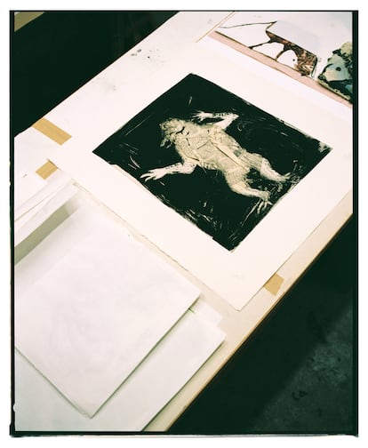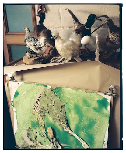 Pero volvamos al arte periodístico que ahora expondrá en ARCOmadrid. Monos hechos de papel de periódico, futbolistas pintados, coches con boñigas encima, prostitutas desnudas, osos armados con rifles (como la ilustración entre cruel y estremecedora que Barceló hizo el 8 de mayo de 2000 sobre la portada de EL PAÍS que narraba el asesinato a manos de ETA del periodista José Luis López de Lacalle), cabeceras de este diario tachadas con pintura amarilla, prolongaciones pintadas de fotos de portada y periódicos enteros estrujados y convertidos en esculturas de papel son algunos de los temas y formatos del Barceló periodista. “Ver hoy esas manipulaciones sobre periódicos es casi como ver arqueología. Bueno, es que eso de poner bigotes a alguien de una foto yo ya lo hacía en la escuela. Creo que antes de los 10 años ya había hecho todo lo que luego he repetido una y otra vez en mi obra. Lo que cambian son los medios, y aprender la técnica, pero eso es poca cosa. Esto que digo no es una boutade, lo digo muy en serio, creo que antes de los 10 años ya has hecho todo lo que vas a hacer en tu vida. Después, solo le das forma”, explica el artista mientras compartimos unas cervezas en uno de los dos talleres de cerámica que tiene en Vilafranca de Bonany, en el centro de Mallorca.