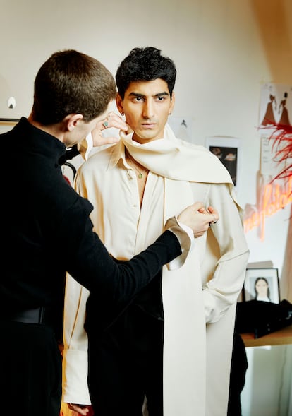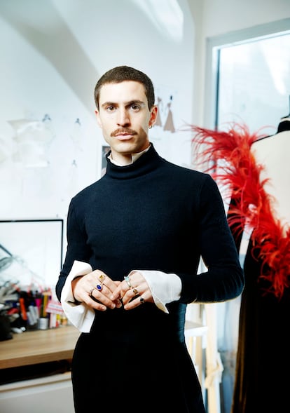 De aquella experiencia también obtuvo una sensibilidad especial hacia los bordados, los tejidos, los encajes y las fornituras de una gran casa de moda. Y todo eso lo plasmó, cuando se vio confinado y desempleado durante la pandemia, en sus primeras colecciones como autor, que le granjearon el acceso al calendario oficial de la pasarela parisiense y, por primera vez, a ejecutar colecciones con su nombre. “Siempre he sido muy ambicioso, y quise intentarlo. Cuando se me mete una idea en la cabeza, prefiero llevarla a cabo”.