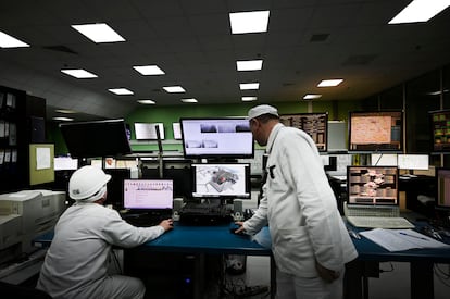 Una comitiva de cinco personas nos espera en la entrada de la central. Lleva inactiva desde el accidente, pero hasta que no se complete el plan de desmantelamiento —ahora interrumpido por la guerra— necesita labores de vigilancia y mantenimiento. “Lo más complejo será retirar y almacenar las más de 200 toneladas de combustible nuclear de los tres reactores restantes. Es uno de los grandes desafíos que tiene Europa”. Lo explica Oleksander Hrihorash, jefe de Protección Civil de la central y, desde este momento, nuestro guía a través de la planta.