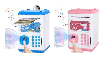 Disponible en siete colores, esta hucha electrónica se presenta en un diseño de caja fuerte y permite guardar tanto monedas como billetes. Se puede cerrar de forma segura porque requiere de una contraseña para desbloquearla y ofrece gran capacidad de almacenaje. Es un producto muy bien valorado en Amazon, donde suma una nota media de 4,4 estrellas sobre 5.