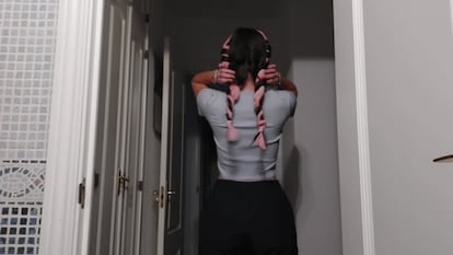 Para ponerme este modelo de rizador me ayudé mejor de la cinta de pelo rosa, que de la pinza porque me parecía más cómodo.